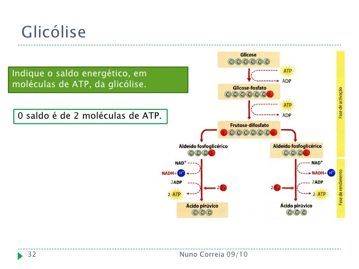32. 32. Glicólise Indique o saldo energético, em moléculas de ATP, da glicólise. 0 saldo é de 2 moléculas de ATP. 32 Nuno Correia 09/10