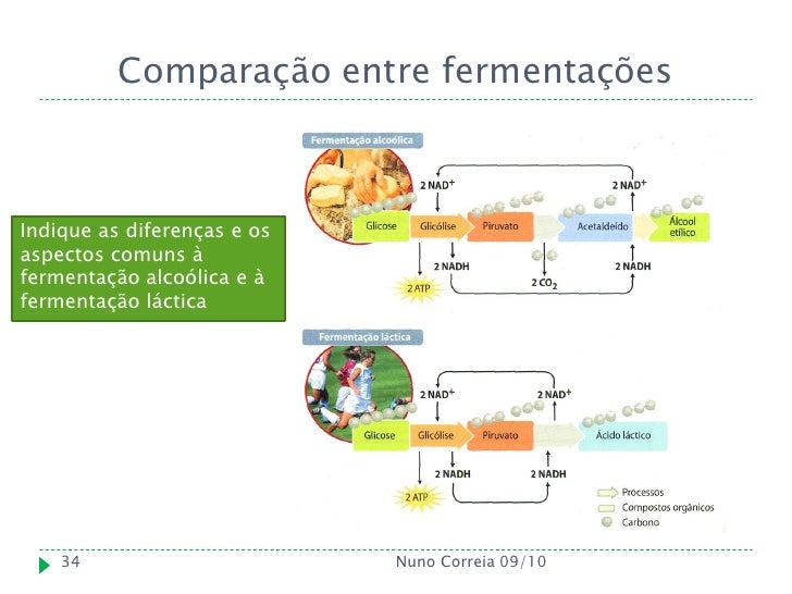 34. 34. Comparação entre fermentações Indique as diferenças e os aspectos comuns à fermentação alcoólica e à fermentação láctica 34 Nuno Correia 09/10