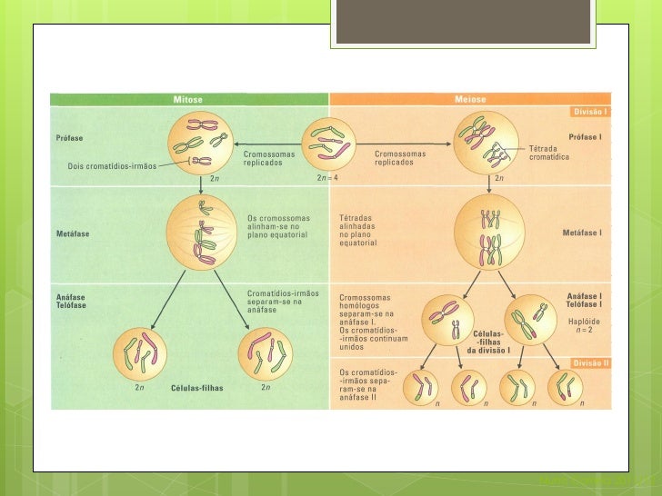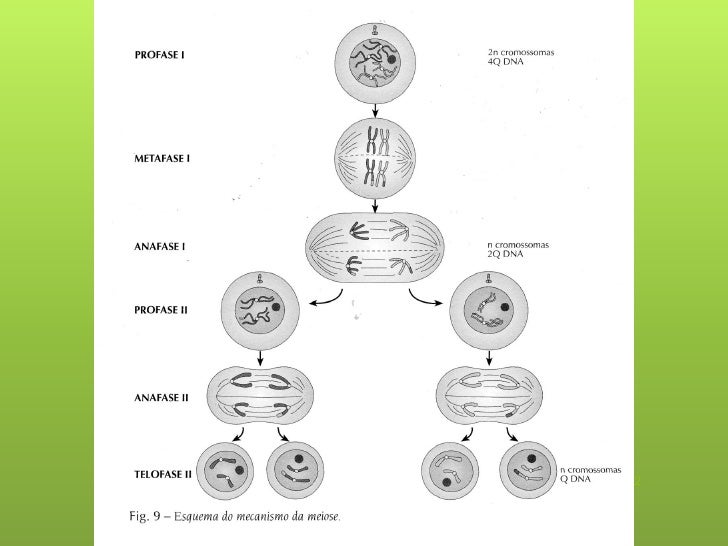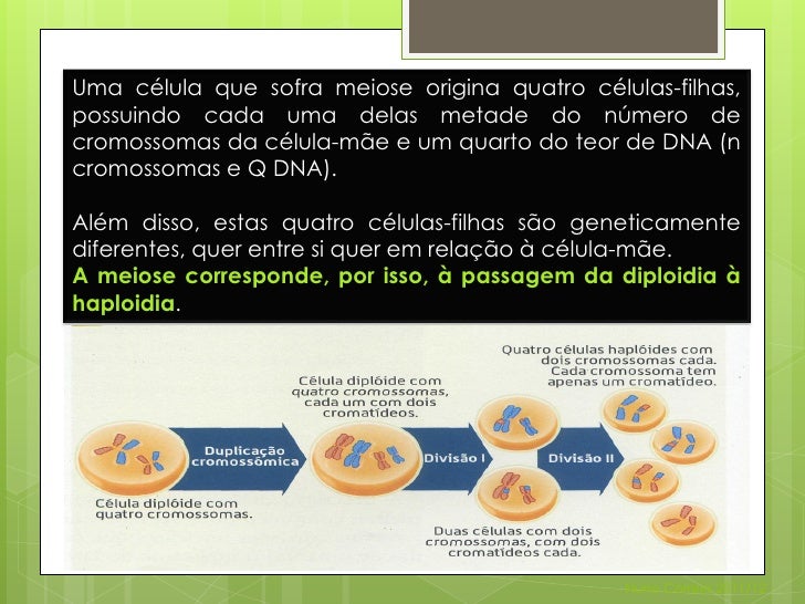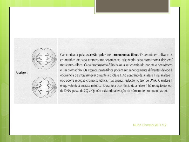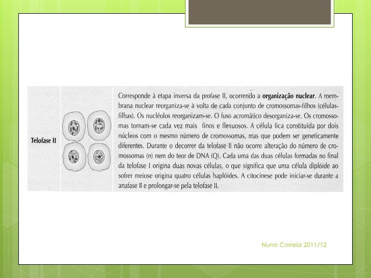 10. 10. Uma célula que sofra meiose origina quatro células-filhas,possuindo cada uma delas metade do número decromossomas da célula-mãe e um quarto do teor de DNA (ncromossomas e Q DNA).Além disso, estas quatro células-filhas são geneticamentediferentes, quer entre si quer em relação à célula-mãe.A meiose corresponde, por isso, à passagem da diploidia àhaploidia. Nuno Correia 2011/12