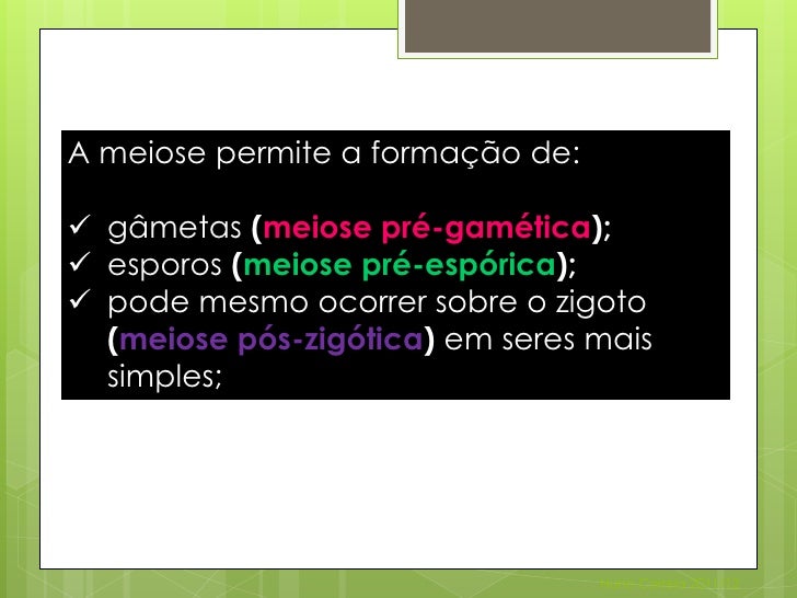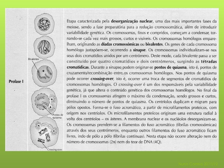 12. 12. A meiose permite a formação de: gâmetas (meiose pré-gamética); esporos (meiose pré-espórica); pode mesmo ocorrer sobre o zigoto (meiose pós-zigótica) em seres mais simples; Nuno Correia 2011/12