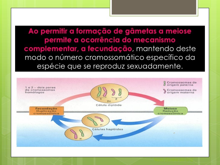 13. 13. Ao permitir a formação de gâmetas a meiose permite a ocorrência do mecanismocomplementar, a fecundação, mantendo destemodo o número cromossomático específico da espécie que se reproduz sexuadamente. Nuno Correia 2011/12
