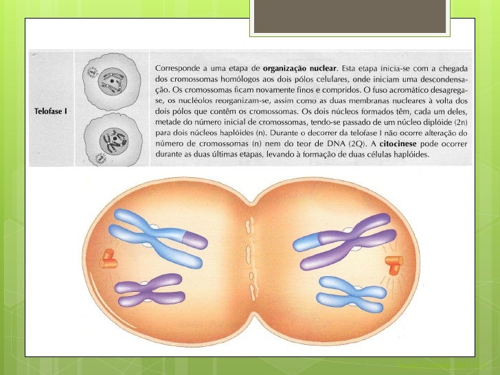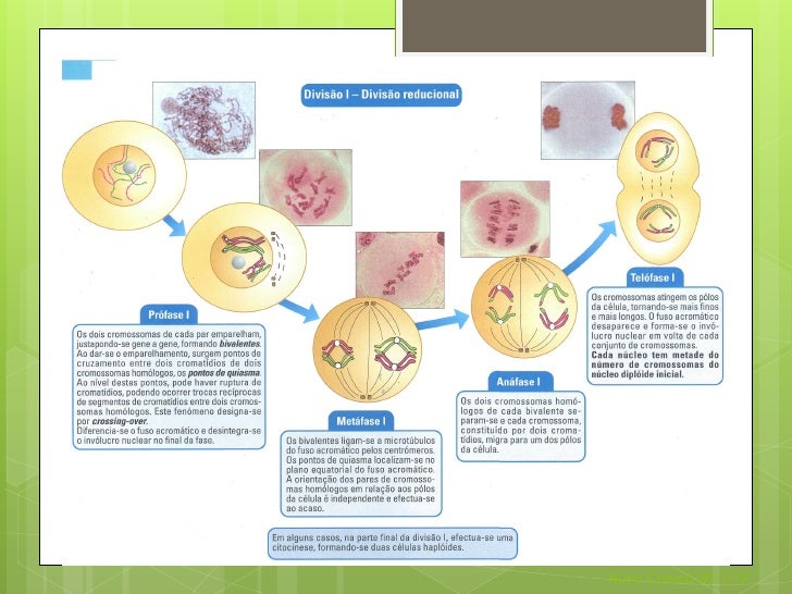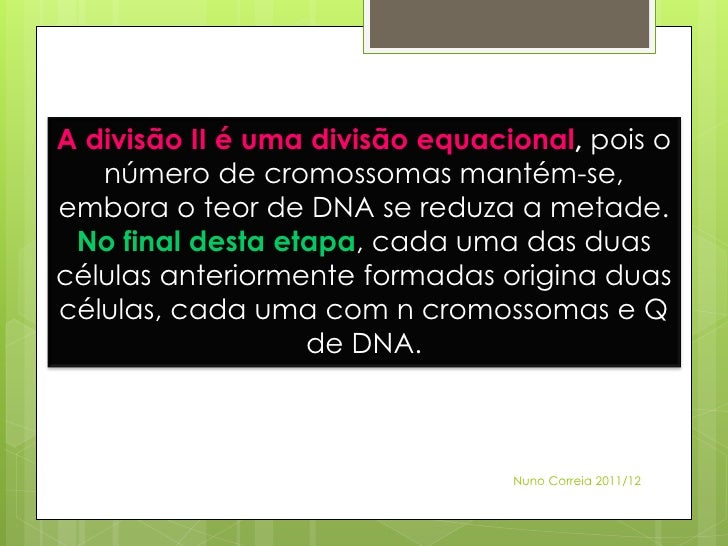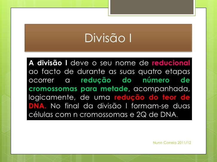 17. 17. Divisão IA divisão l deve o seu nome de reducionalao facto de durante as suas quatro etapasocorrer a redução do número decromossomas para metade, acompanhada,logicamente, de uma redução do teor deDNA. No final da divisão l formam-se duascélulas com n cromossomas e 2Q de DNA. Nuno Correia 2011/12