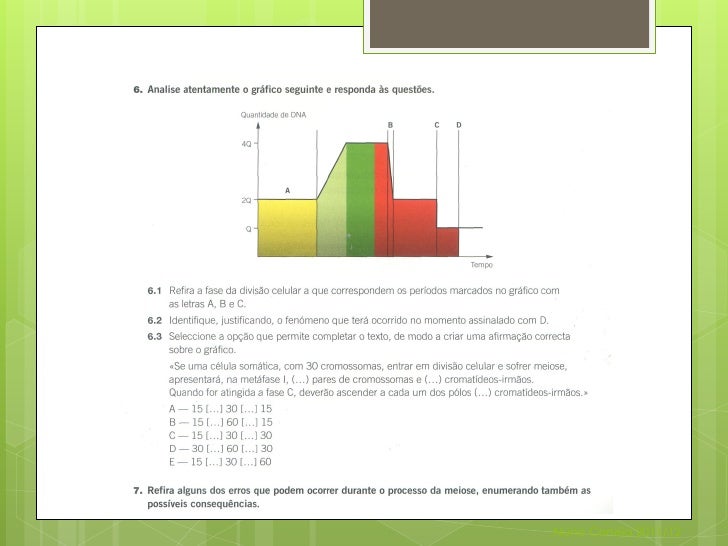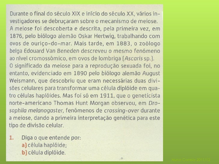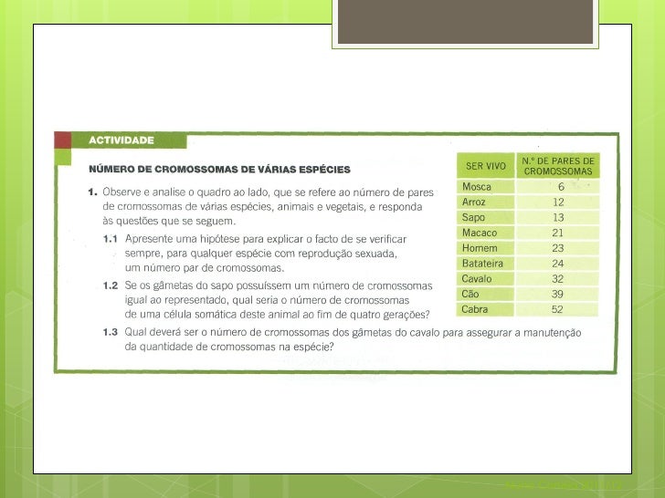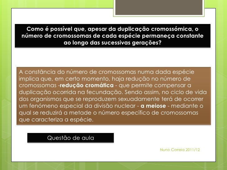 63. 63. Como é possível que, apesar da duplicação cromossómica, onúmero de cromossomas de cada espécie permaneça constante ao longo das sucessivas gerações?A constância do número de cromossomas numa dada espécieimplica que, em certo momento, haja redução no número decromossomas -redução cromática - que permite compensar aduplicação ocorrida na fecundação. Sendo assim, no ciclo de vidados organismos que se reproduzem sexuadamente terá de ocorrerum fenómeno especial da divisão nuclear - a meiose - mediante oqual se reduzirá a metade o número específico de cromossomasque caracteriza a espécie. Questão de aula Nuno Correia 2011/12