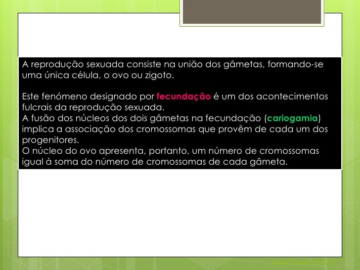 6. 6. A reprodução sexuada consiste na união dos gâmetas, formando-seuma única célula, o ovo ou zigoto.Este fenómeno designado por fecundação é um dos acontecimentosfulcrais da reprodução sexuada.A fusão dos núcleos dos dois gâmetas na fecundação (cariogamia)implica a associação dos cromossomas que provêm de cada um dosprogenitores.O núcleo do ovo apresenta, portanto, um número de cromossomasigual à soma do número de cromossomas de cada gâmeta. Nuno Correia 2011/12