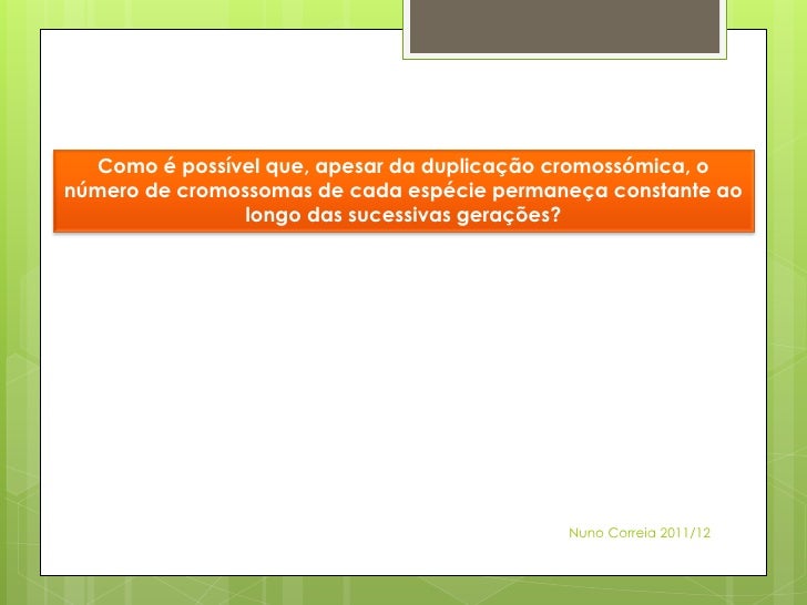 7. 7. Como é possível que, apesar da duplicação cromossómica, onúmero de cromossomas de cada espécie permaneça constante ao longo das sucessivas gerações? Nuno Correia 2011/12