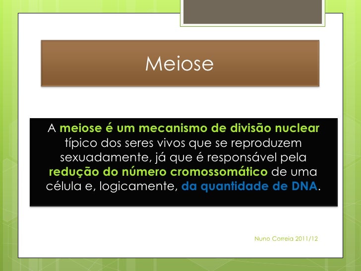 9. 9. MeioseA meiose é um mecanismo de divisão nuclear típico dos seres vivos que se reproduzem sexuadamente, já que é responsável pelaredução do número cromossomático de umacélula e, logicamente, da quantidade de DNA. Nuno Correia 2011/12