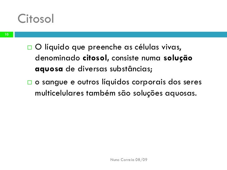 10. 10. Citosol 10 O líquido que preenche as células vivas,  denominado citosol, consiste numa solução aquosa de diversas substâncias; o sangue e outros líquidos corporais dos seres  multicelulares também são soluções aquosas. Nuno Correia 08/09
