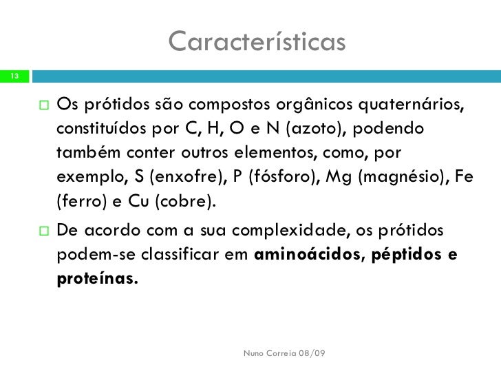13. 13. Características 13 Os prótidos são compostos orgânicos quaternários,  constituídos por C, H, O e N (azoto), podendo também conter outros elementos, como, por exemplo, S (enxofre), P (fósforo), Mg (magnésio), Fe (ferro) e Cu (cobre). De acordo com a sua complexidade, os prótidos  podem-se classificar em aminoácidos, péptidos e proteínas. Nuno Correia 08/09
