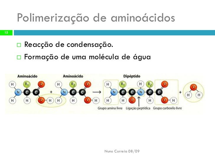 15. 15. Polimerização de aminoácidos 15 Reacção de condensação.  Formação de uma molécula de água  Nuno Correia 08/09