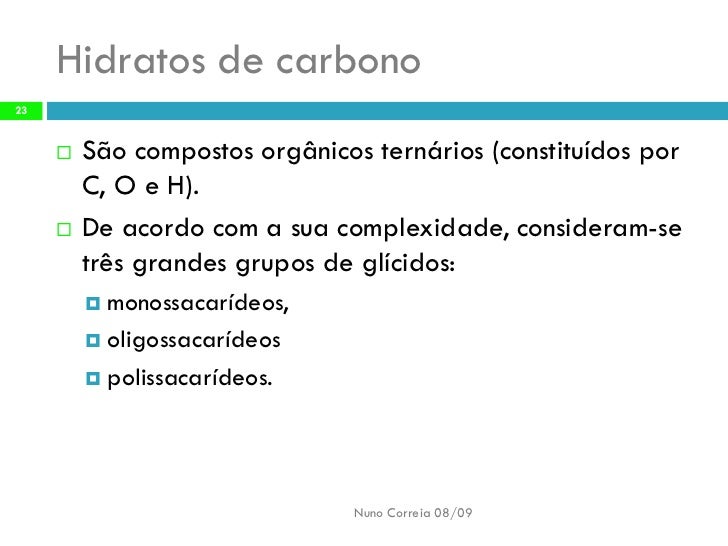 23. 23. Hidratos de carbono 23 São compostos orgânicos ternários (constituídos por  C, O e H). De acordo com a sua complexidade, consideram-se  três grandes grupos de glícidos:  monossacarídeos,  oligossacarídeos  polissacarídeos. Nuno Correia 08/09