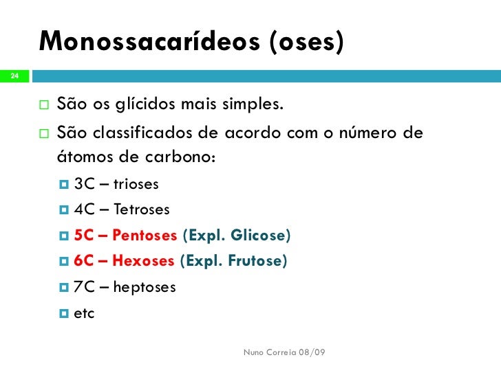 24. 24. Monossacarídeos (oses) 24 São os glícidos mais simples.  São classificados de acordo com o número de  átomos de carbono:  3C – trioses  4C – Tetroses  5C – Pentoses (Expl. Glicose)  6C – Hexoses (Expl. Frutose)  7C – heptoses  etc Nuno Correia 08/09