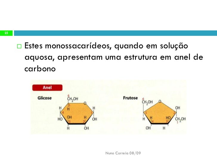 25. 25. 25 Estes monossacarídeos, quando em solução  aquosa, apresentam uma estrutura em anel de carbono Nuno Correia 08/09