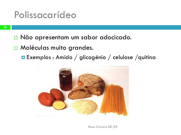 28. 28. Polissacarídeo 28 Não apresentam um sabor adocicado.  Moléculas muito grandes.   Exemplos : Amido / glicogénio / celulose /quitina Nuno Correia 08/09