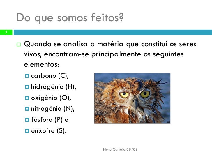 3. 3. Do que somos feitos? 3 Quando se analisa a matéria que constitui os seres  vivos, encontram-se principalmente os seguintes elementos:  carbono (C),  hidrogénio (H),  oxigénio (O),  nitrogénio (N),  fósforo (P) e  enxofre (S). Nuno Correia 08/09
