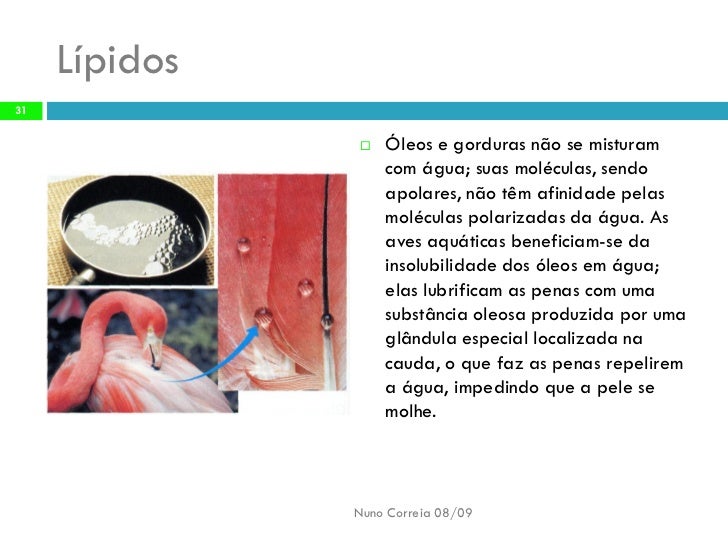 31. 31. Lípidos 31 Óleos e gorduras não se misturam  com água; suas moléculas, sendo apolares, não têm afinidade pelas moléculas polarizadas da água. As aves aquáticas beneficiam-se da insolubilidade dos óleos em água; elas lubrificam as penas com uma substância oleosa produzida por uma glândula especial localizada na cauda, o que faz as penas repelirem a água, impedindo que a pele se molhe. Nuno Correia 08/09
