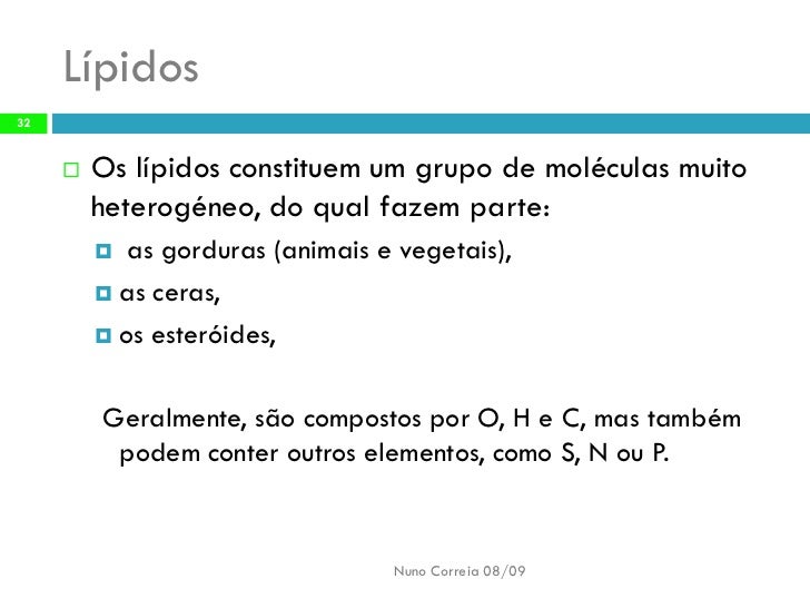 32. 32. Lípidos 32 Os lípidos constituem um grupo de moléculas muito  heterogéneo, do qual fazem parte: as gorduras (animais e vegetais),   as ceras,  os esteróides, Geralmente, são compostos por O, H e C, mas também podem conter outros elementos, como S, N ou P. Nuno Correia 08/09