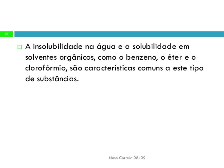 33. 33. 33 A insolubilidade na água e a solubilidade em  solventes orgânicos, como o benzeno, o éter e o clorofórmio, são características comuns a este tipo de substâncias. Nuno Correia 08/09