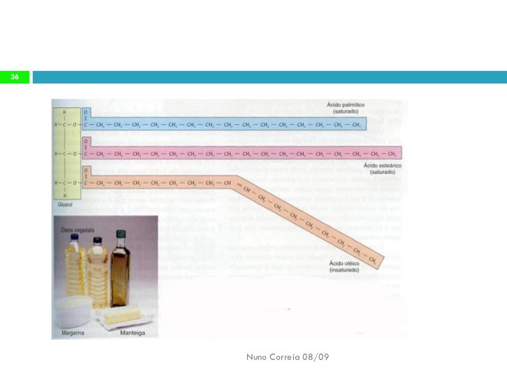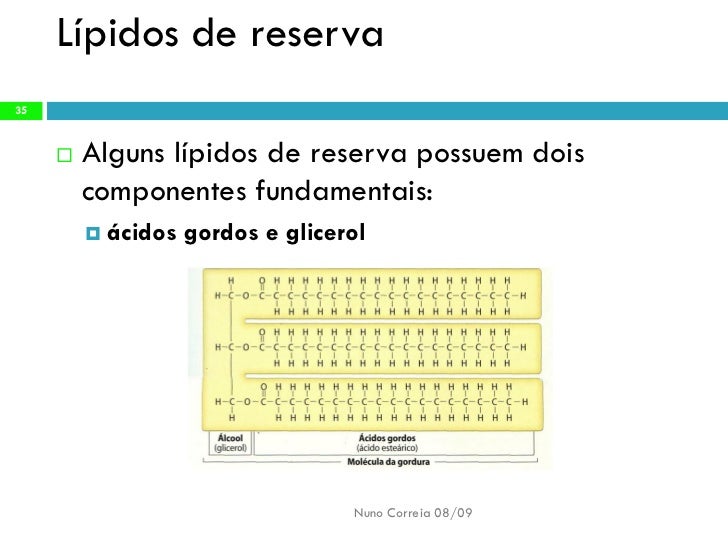 35. 35. Lípidos de reserva 35 Alguns lípidos de reserva possuem dois  componentes fundamentais:  ácidos gordos e glicerol Nuno Correia 08/09