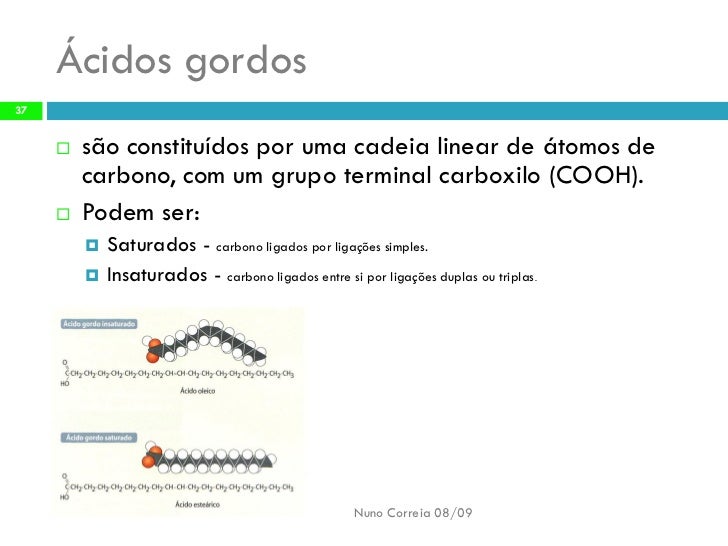 37. 37. Ácidos gordos 37 são constituídos por uma cadeia linear de átomos de  carbono, com um grupo terminal carboxilo (COOH). Podem ser:  Saturados - carbono ligados por ligações simples.  Insaturados - carbono ligados entre si por ligações duplas ou triplas.  Nuno Correia 08/09
