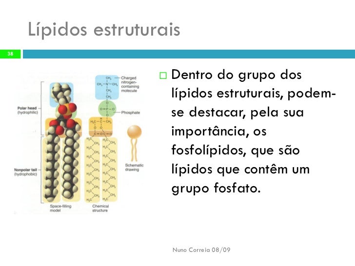 38. 38. Lípidos estruturais 38 Dentro do grupo dos  lípidos estruturais, podem- se destacar, pela sua importância, os fosfolípidos, que são lípidos que contêm um grupo fosfato. Nuno Correia 08/09
