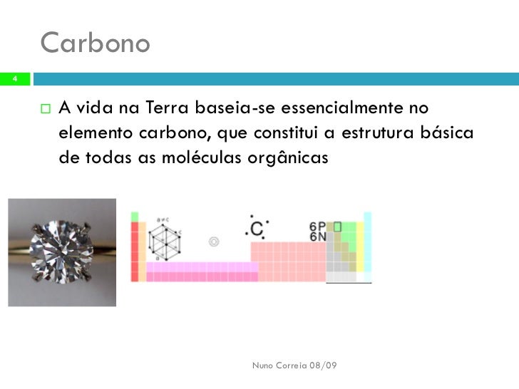 4. 4. Carbono 4 A vida na Terra baseia-se essencialmente no  elemento carbono, que constitui a estrutura básica de todas as moléculas orgânicas Nuno Correia 08/09