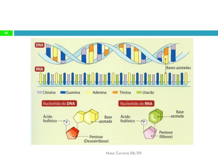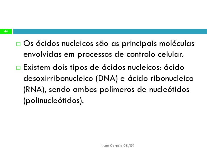 44. 44. 44 Os ácidos nucleicos são as principais moléculas  envolvidas em processos de controlo celular.  Existem dois tipos de ácidos nucleicos: ácido desoxirribonucleico (DNA) e ácido ribonucleico (RNA), sendo ambos polímeros de nucleótidos (polinucleótidos). Nuno Correia 08/09