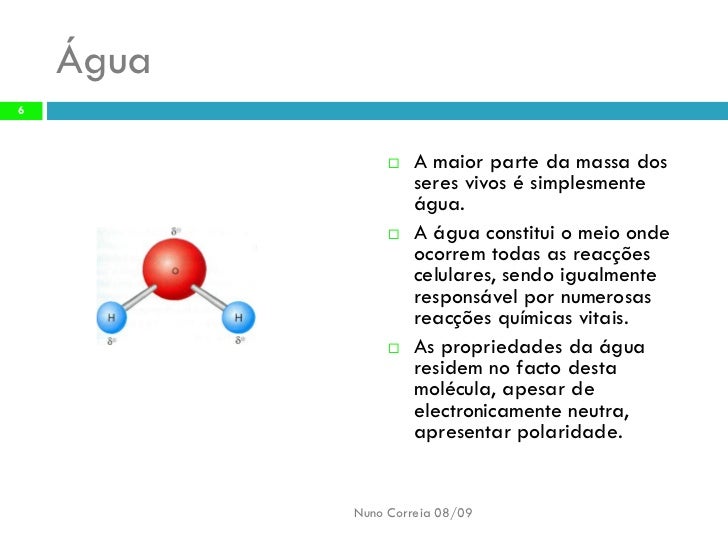 6. 6. Água 6 A maior parte da massa dos  seres vivos é simplesmente água. A água constitui o meio onde  ocorrem todas as reacções celulares, sendo igualmente responsável por numerosas reacções químicas vitais. As propriedades da água  residem no facto desta molécula, apesar de electronicamente neutra, apresentar polaridade. Nuno Correia 08/09