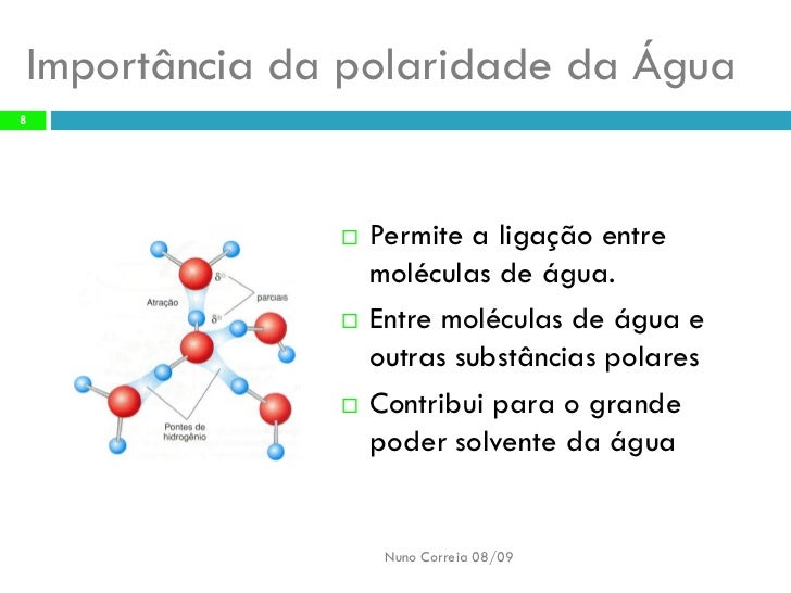 8. 8. Importância da polaridade da Água 8 Permite a ligação entre  moléculas de água. Entre moléculas de água e  outras substâncias polares Contribui para o grande  poder solvente da água Nuno Correia 08/09