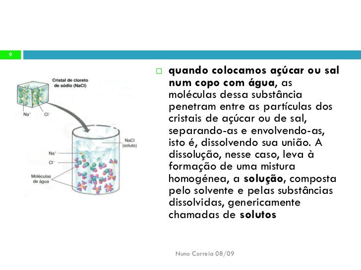 9. 9. 9 quando colocamos açúcar ou sal  num copo com água, as moléculas dessa substância penetram entre as partículas dos cristais de açúcar ou de sal, separando-as e envolvendo-as, isto é, dissolvendo sua união. A dissolução, nesse caso, leva à formação de uma mistura homogénea, a solução, composta pelo solvente e pelas substâncias dissolvidas, genericamente chamadas de solutos Nuno Correia 08/09
