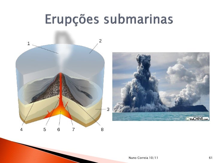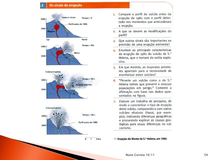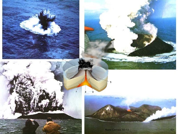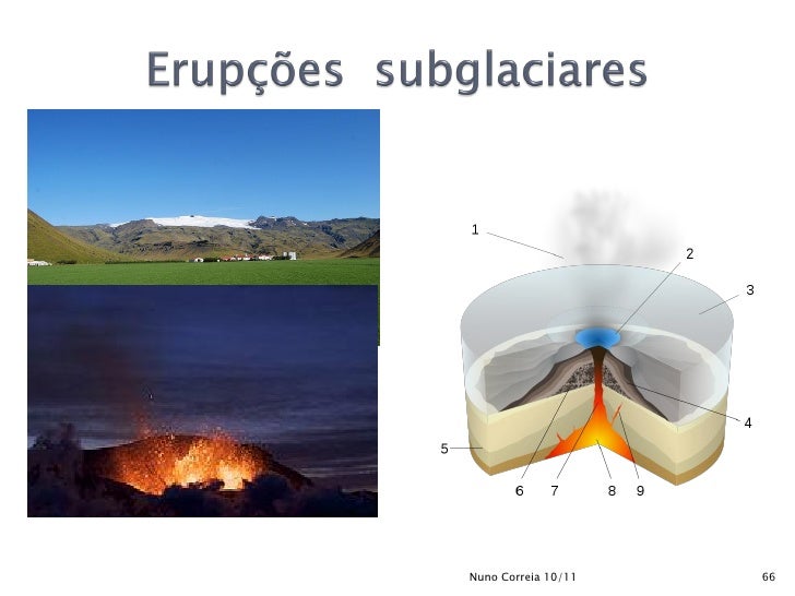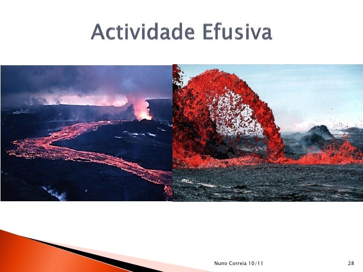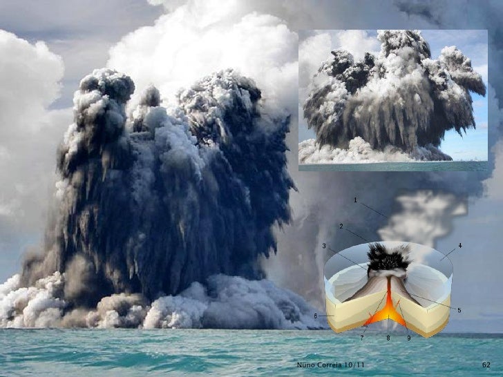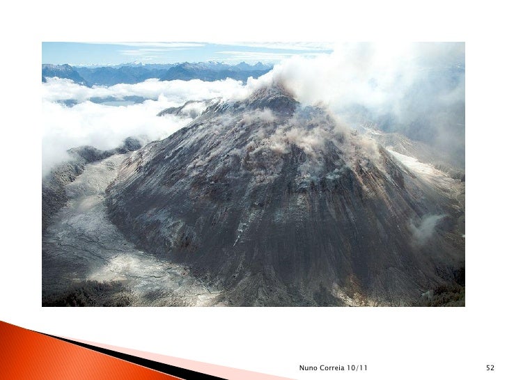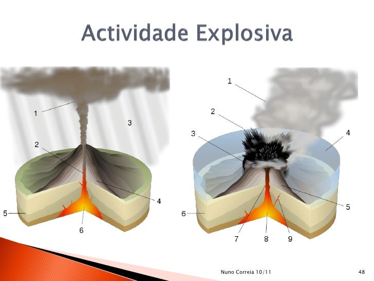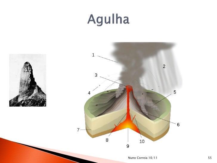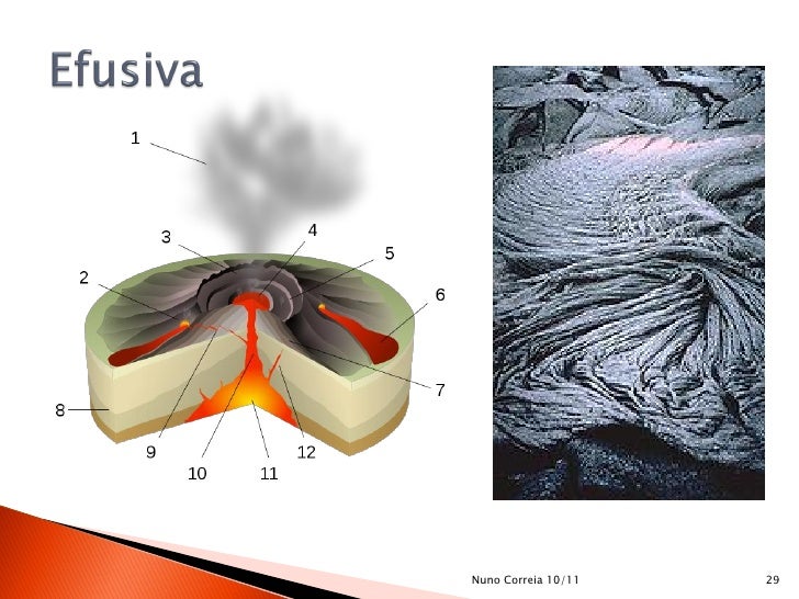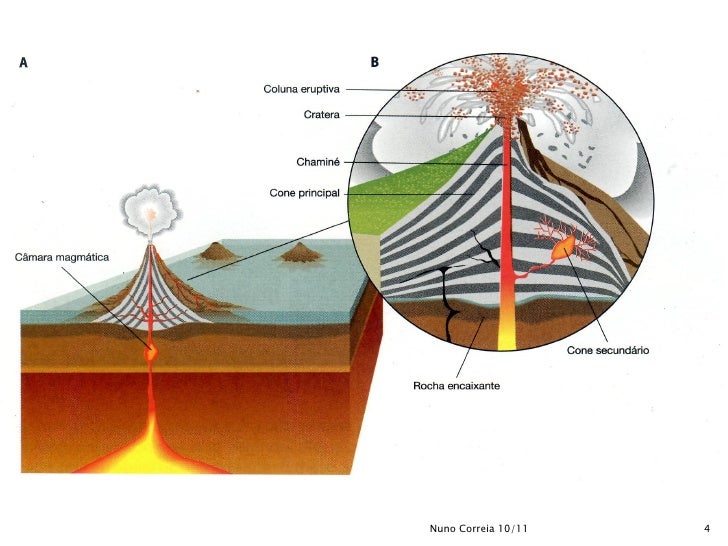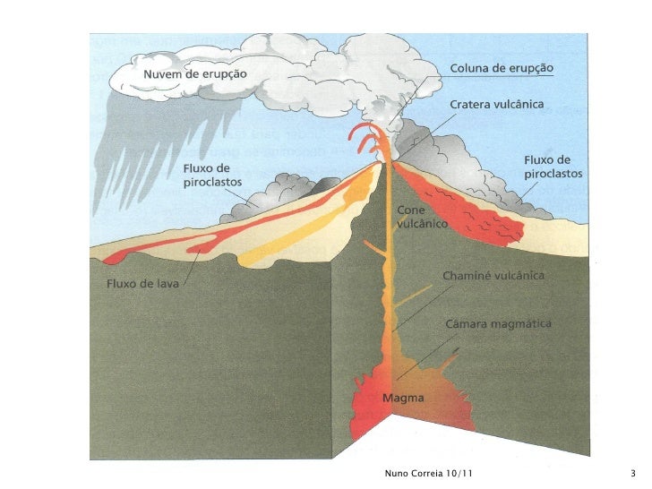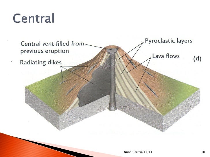 10. 10.  A erupção ocorre num aparelho vulcânico designado por vulcão. Possui uma chaminé cilíndrica, uma cratera circular central num cone mais ou menos elevado, por onde saem as lavas e os materiais piroclásticos. As crateras encontram-se ligadas a chaminés cilíndricas. Esta actividade vulcânica corresponde à típica actividade continental. Nuno Correia 10/11 11