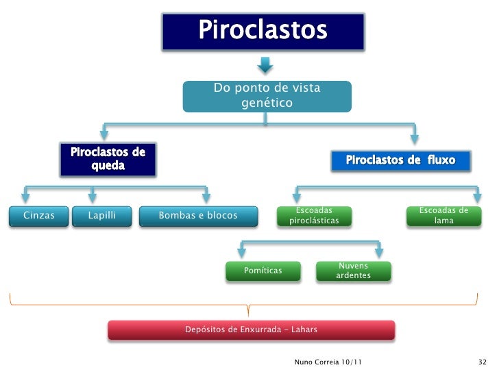31. 31. Do ponto de vista genético Escoadas Escoadas deCinzas Lapilli Bombas e blocos piroclásticas lama Nuvens Pomíticas ardentes Depósitos de Enxurrada - Lahars Nuno Correia 10/11 32