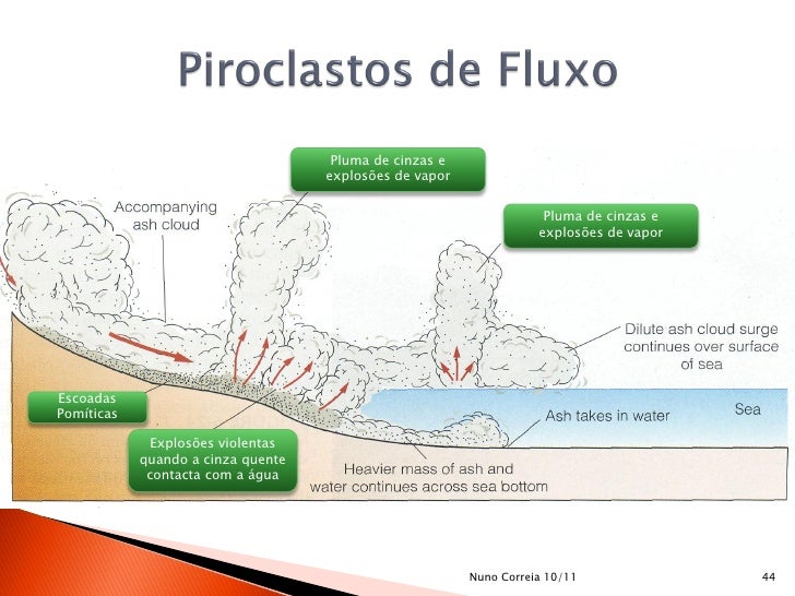 43. 43. Pluma de cinzas e explosões de vapor Pluma de cinzas e explosões de vaporEscoadasPomíticas Explosões violentas quando a cinza quente contacta com a água Nuno Correia 10/11 44