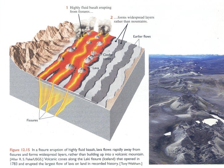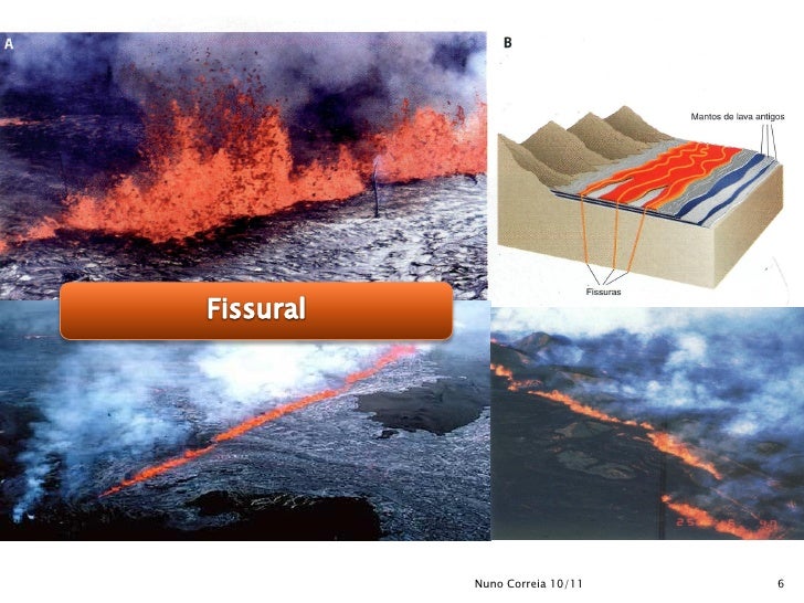 6. 6.  As erupções ocorrem ao longo de fracturas/fendas da superfície terrestre. Representa o caso mais vulgar de vulcanismo, não possui chaminé cilíndrica, nem cratera circular. Ocorre nas zonas de rifte. As suas lavas são básicas. As erupções, quando são continentais (Decão), originam extensos planaltos de lava basáltica. As erupções subaquáticas vão originar novos fundos oceânicos. Nuno Correia 10/11 7