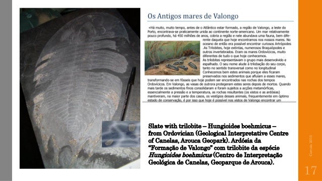 17. 17. Correia2015 17 Slate with trilobite – Hungioides boehmicus – from Ordovician (Geological Interpretative Centre of Canelas, Arouca Geopark). Ardósia da “Formação de Valongo” com trilobite da espécie Hungioides boehmicus (Centro de Interpretação Geológica de Canelas, Geoparque de Arouca).