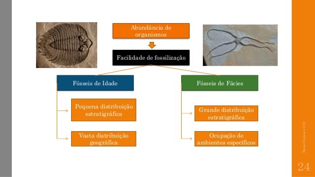24. 24. NunoCorreia11/12 24 Abundância de organismos Facilidade de fossilização Fósseis de Idade Fósseis de Fácies Pequena distribuição estratigráfica Vasta distribuição geográfica Grande distribuição estratigráfica Ocupação de ambientes específicos