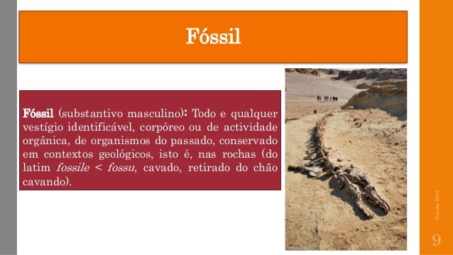 9. 9. Fóssil Correia2015 9 Fóssil (substantivo masculino): Todo e qualquer vestígio identificável, corpóreo ou de actividade orgânica, de organismos do passado, conservado em contextos geológicos, isto é, nas rochas (do latim fossile < fossu, cavado, retirado do chão cavando).
