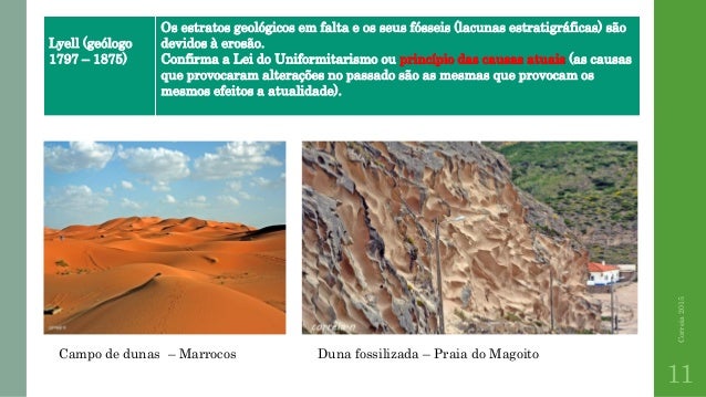 11. 11. Correia2015 11 Lyell (geólogo 1797 – 1875) Os estratos geológicos em falta e os seus fósseis (lacunas estratigráficas) são devidos à erosão. Confirma a Lei do Uniformitarismo ou princípio das causas atuais (as causas que provocaram alterações no passado são as mesmas que provocam os mesmos efeitos a atualidade). Duna fossilizada – Praia do MagoitoCampo de dunas – Marrocos