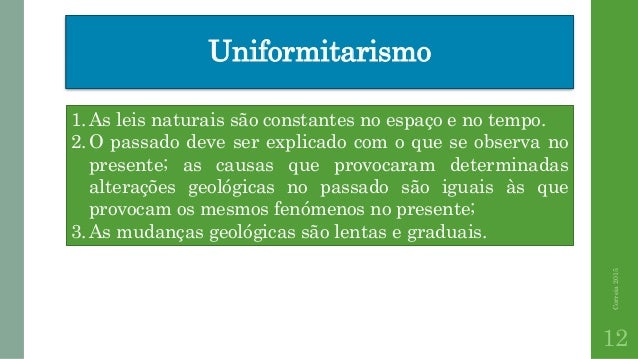 12. 12. Uniformitarismo Correia2015 12 1.As leis naturais são constantes no espaço e no tempo. 2.O passado deve ser explicado com o que se observa no presente; as causas que provocaram determinadas alterações geológicas no passado são iguais às que provocam os mesmos fenómenos no presente; 3.As mudanças geológicas são lentas e graduais.