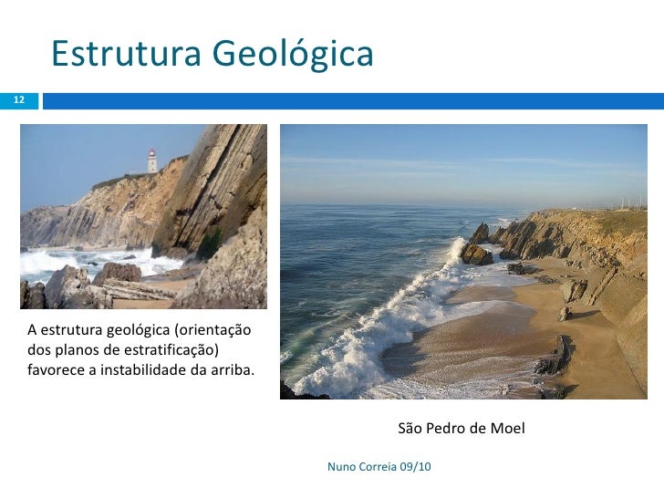 12. 12. Estrutura Geológica 12 A estrutura geológica (orientação dos planos de estratificação) favorece a instabilidade da arriba. São Pedro de Moel Nuno Correia 09/10