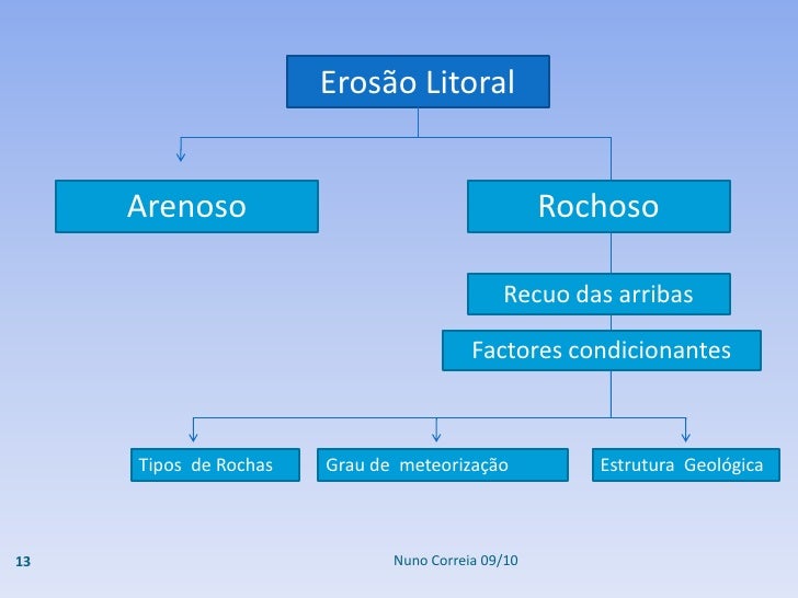 13. 13. Erosão Litoral Arenoso Rochoso Recuo das arribas Factores condicionantes Tipos de Rochas Grau de meteorização Estrutura Geológica 13 Nuno Correia 09/10