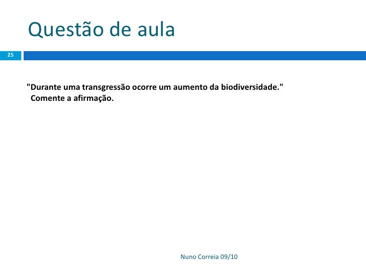25. 25. Questão de aula 25 "Durante uma transgressão ocorre um aumento da biodiversidade." Comente a afirmação. Nuno Correia 09/10