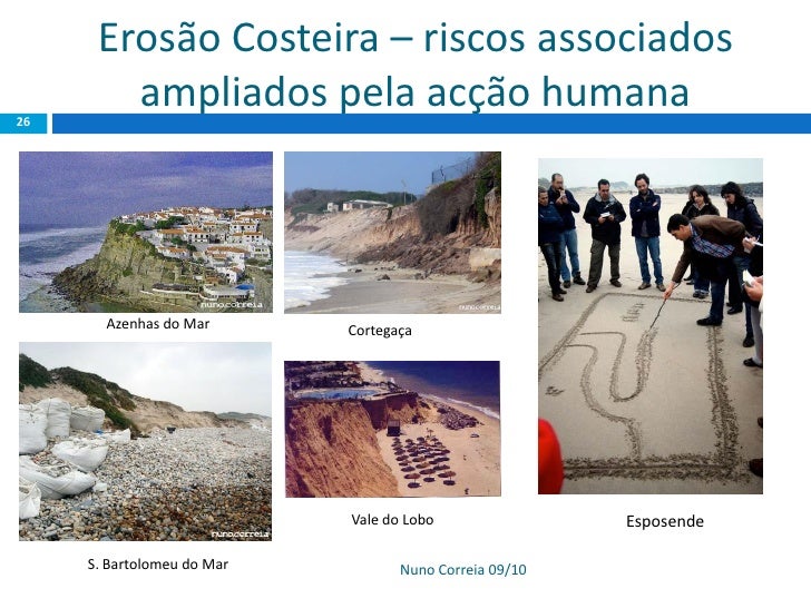 26. 26. Erosão Costeira – riscos associados 26 ampliados pela acção humana Azenhas do Mar Cortegaça Vale do Lobo Esposende S. Bartolomeu do Mar Nuno Correia 09/10