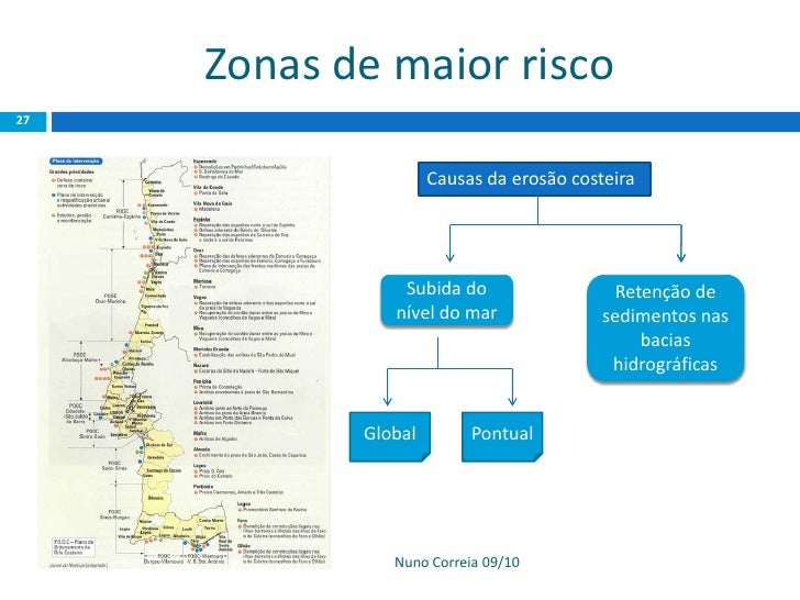 27. 27. Zonas de maior risco 27 Causas da erosão costeira Subida do Retenção de nível do mar sedimentos nas bacias hidrográficas Global Pontual Nuno Correia 09/10