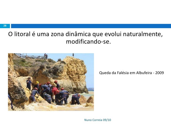 28. 28. 28 O litoral é uma zona dinâmica que evolui naturalmente, modificando-se. Queda da Falésia em Albufeira - 2009 Nuno Correia 09/10