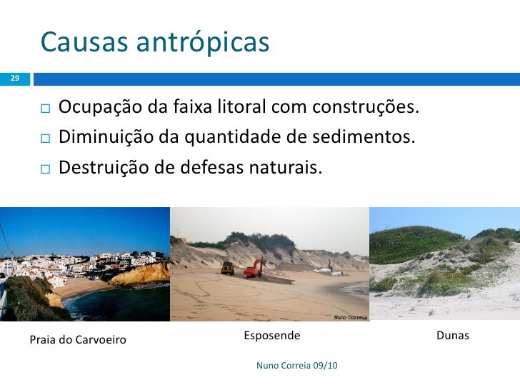 29. 29. Causas antrópicas 29  Ocupação da faixa litoral com construções.  Diminuição da quantidade de sedimentos.  Destruição de defesas naturais. Praia do Carvoeiro Esposende Dunas Nuno Correia 09/10
