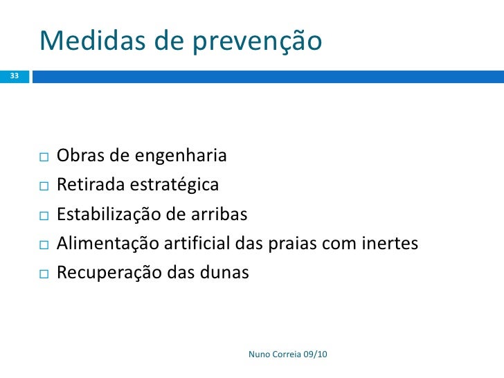 33. 33. Medidas de prevenção 33  Obras de engenharia  Retirada estratégica  Estabilização de arribas  Alimentação artificial das praias com inertes  Recuperação das dunas Nuno Correia 09/10