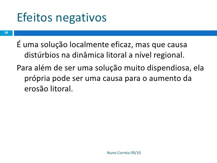 38. 38. Efeitos negativos 38 É uma solução localmente eficaz, mas que causa distúrbios na dinâmica litoral a nível regional. Para além de ser uma solução muito dispendiosa, ela própria pode ser uma causa para o aumento da erosão litoral. Nuno Correia 09/10