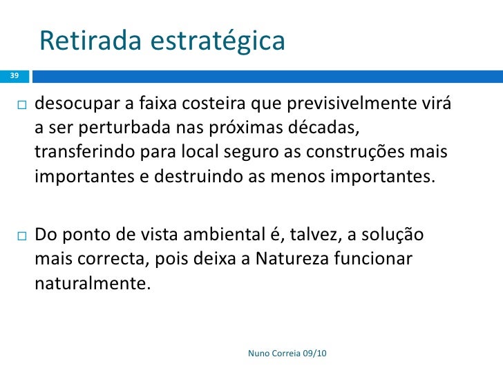 39. 39. Retirada estratégica 39  desocupar a faixa costeira que previsivelmente virá a ser perturbada nas próximas décadas, transferindo para local seguro as construções mais importantes e destruindo as menos importantes.  Do ponto de vista ambiental é, talvez, a solução mais correcta, pois deixa a Natureza funcionar naturalmente. Nuno Correia 09/10
