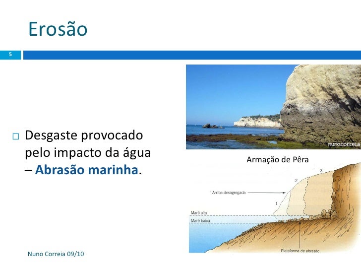 5. 5. Erosão 5  Desgaste provocado pelo impacto da água Armação de Pêra – Abrasão marinha. Nuno Correia 09/10