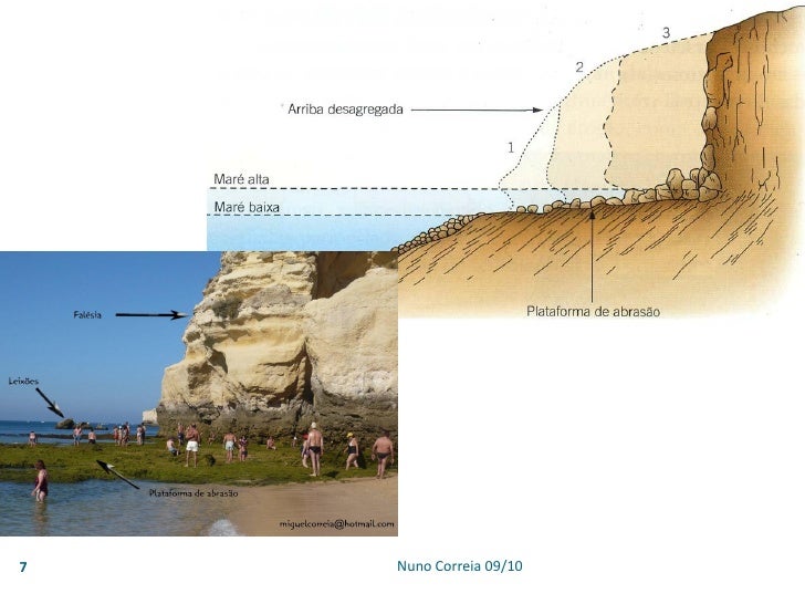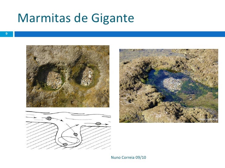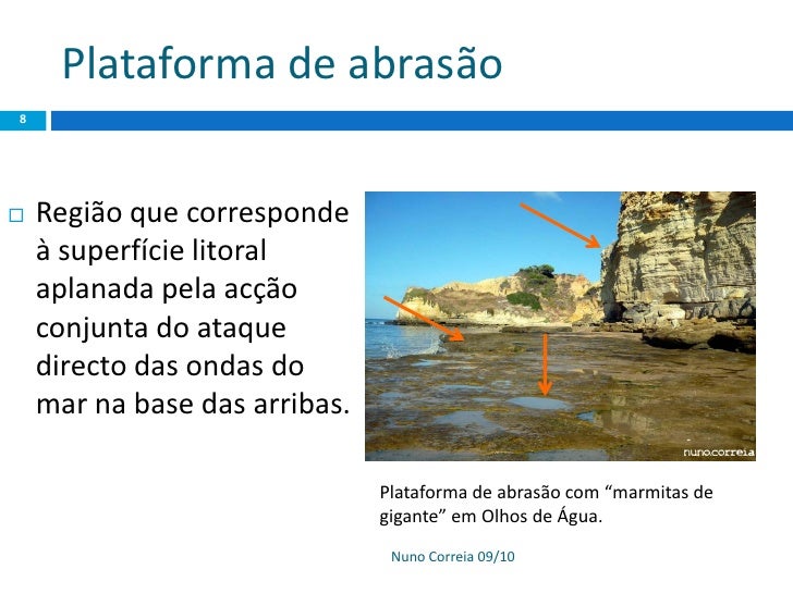 8. 8. Plataforma de abrasão 8  Região que corresponde à superfície litoral aplanada pela acção conjunta do ataque directo das ondas do mar na base das arribas. Plataforma de abrasão com “marmitas de gigante” em Olhos de Água. Nuno Correia 09/10